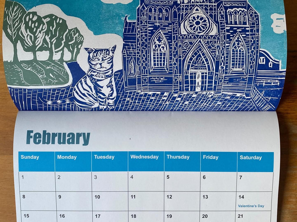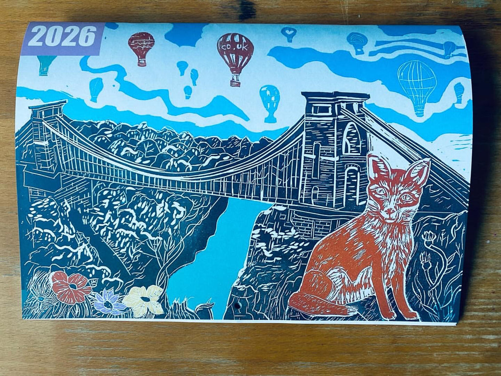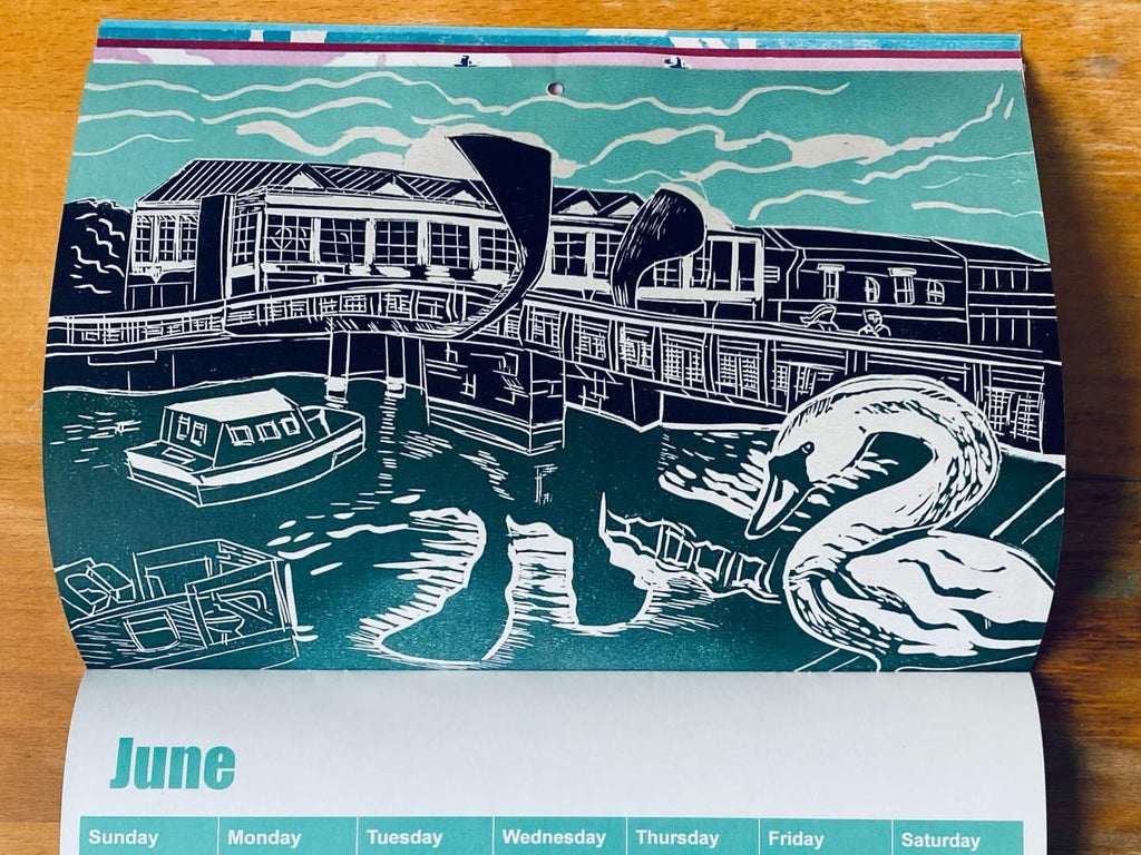 An incredible Bristol calendar featuring 12 illustrations of original lino prints by Lucy Baik.
