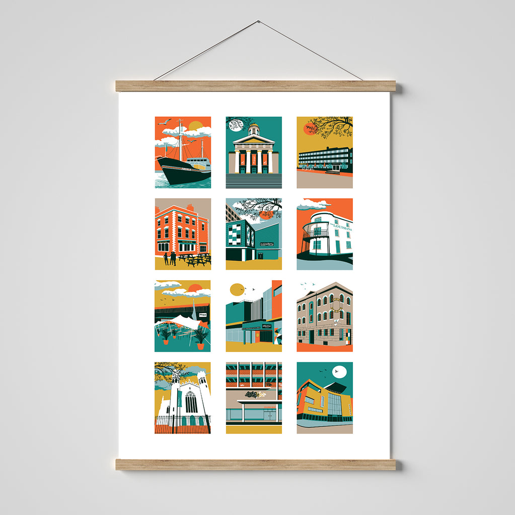 Susan fuses screen printing and digital illustration with experimental typefaces to create her retro-styled designs. Her passion for graphic design is evident – typography, iconography, bold swathes of colour and a strong structural layout are consistently the focus of her work.