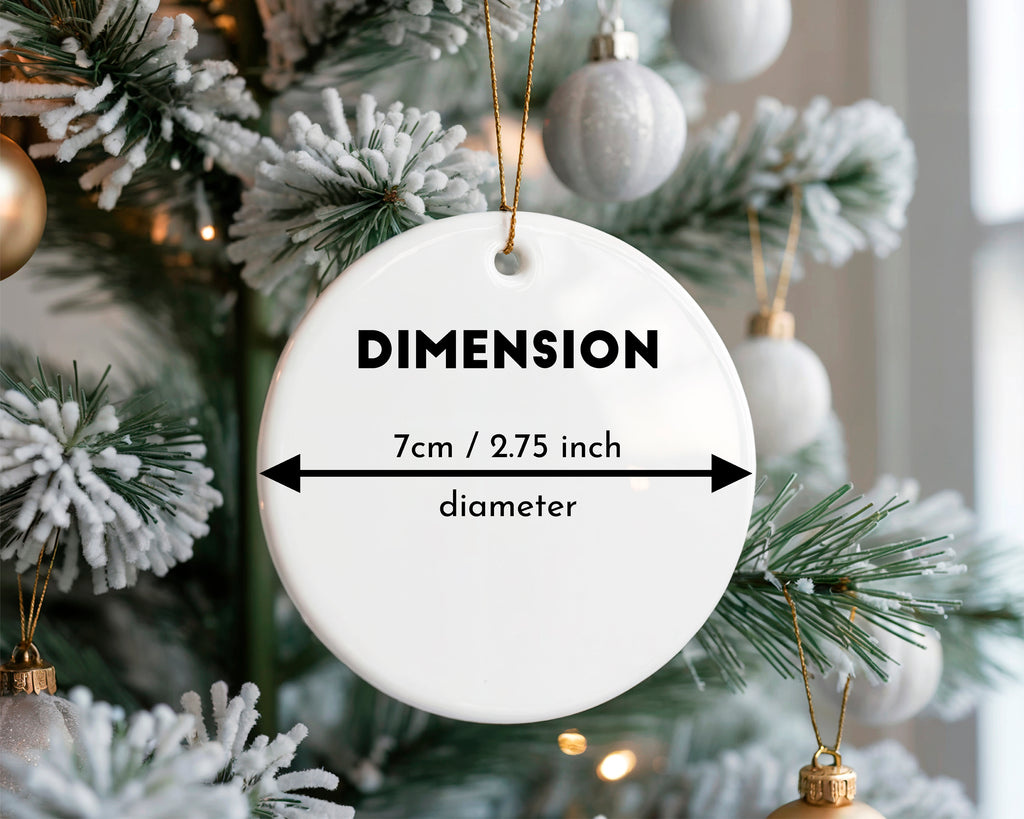 These ceramic flat baubles include a gold string to hang onto a Christmas tree.