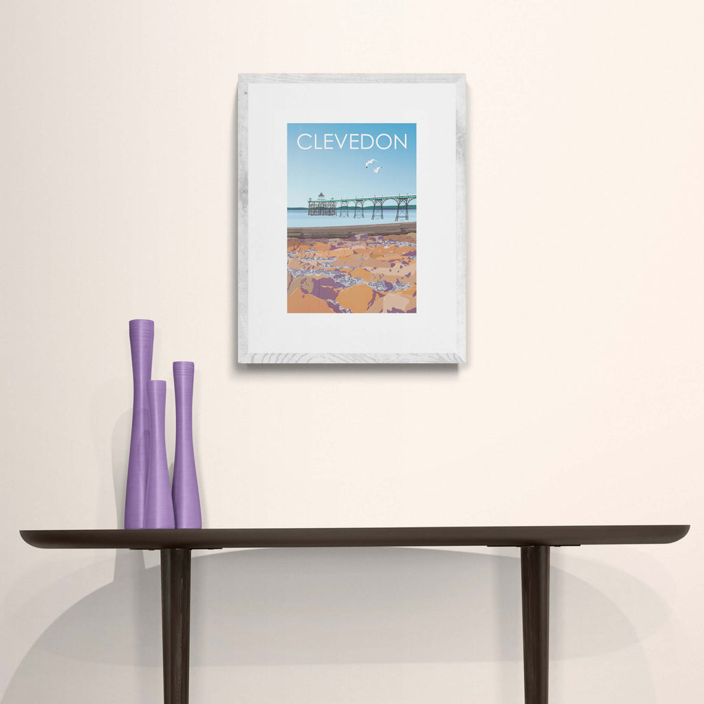 Clevedon in North Somerset is a wonderful West Country coastal town close to the city of Bristol. In this art quality print is the iconic Clevedon pier with the Welsh mountains in the distance and a foreground brightly coloured rocky beach.